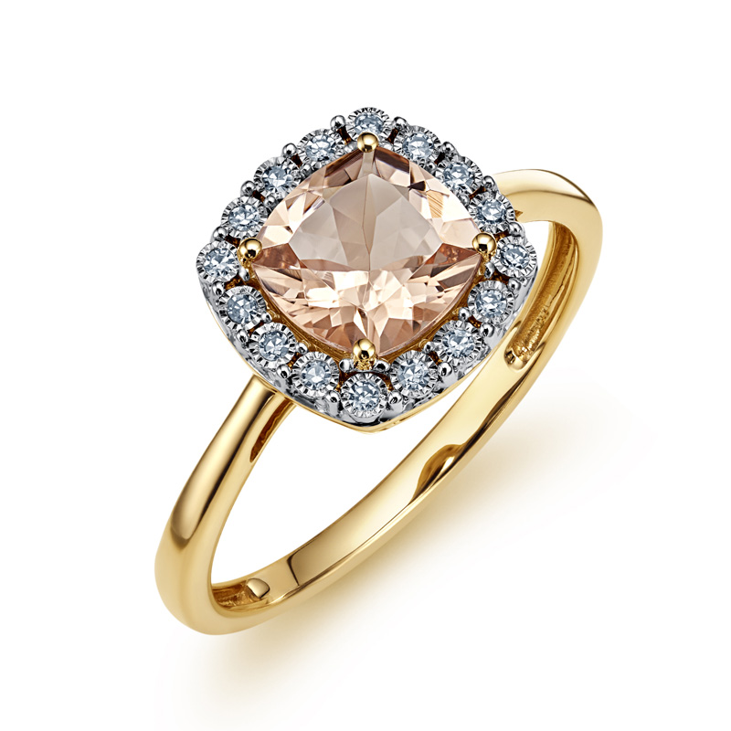 Sárga arany női gyűrű természetes peach morganite és gyémánt kövekkel.