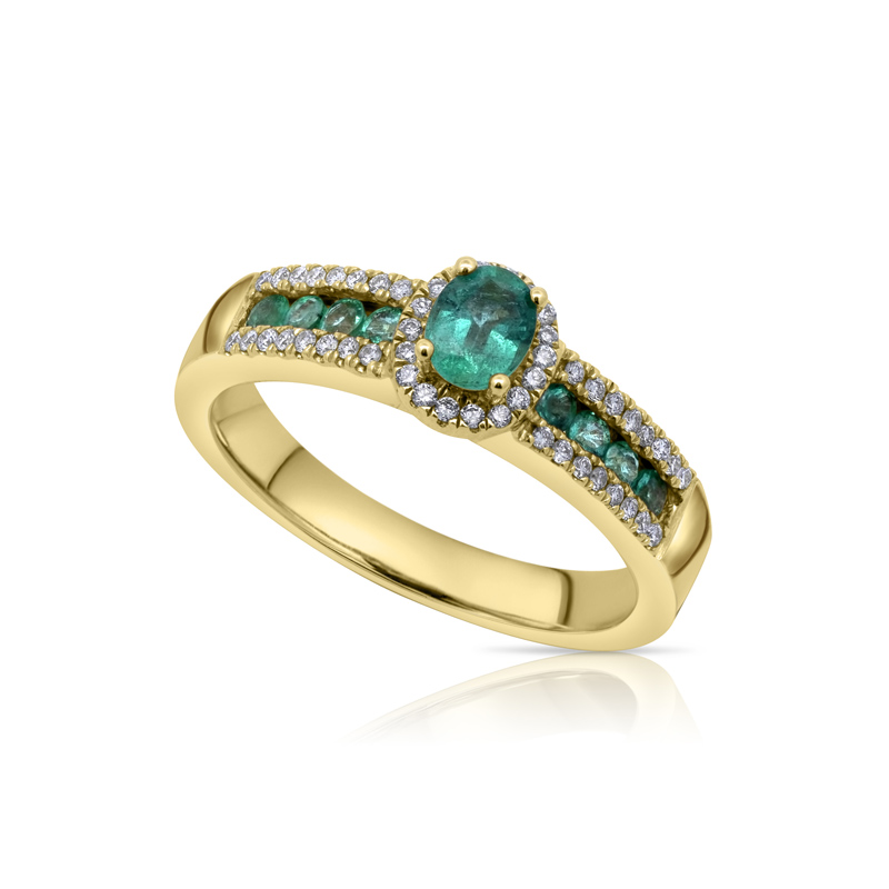Sárga arany női gyűrű természetes smaragd és gyémánt kövekkel.