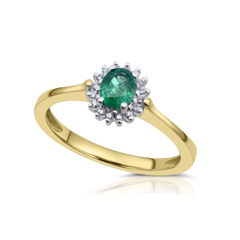 Sárga arany női gyűrű természetes smaragd és gyémánt kövekkel.