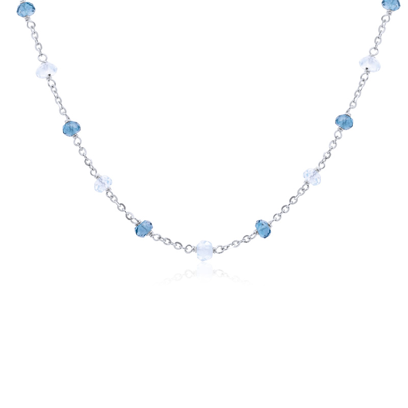 Letisztult, modern, strapabíró nyaklánc fehér aranyból, melyet 43 darab világosabb és sötétebb kék topáz kő ékesít. A nyaklánc végén egy 2cm-es állítható szakasz van, így lehet passzosan vagy lezseren is viselni.