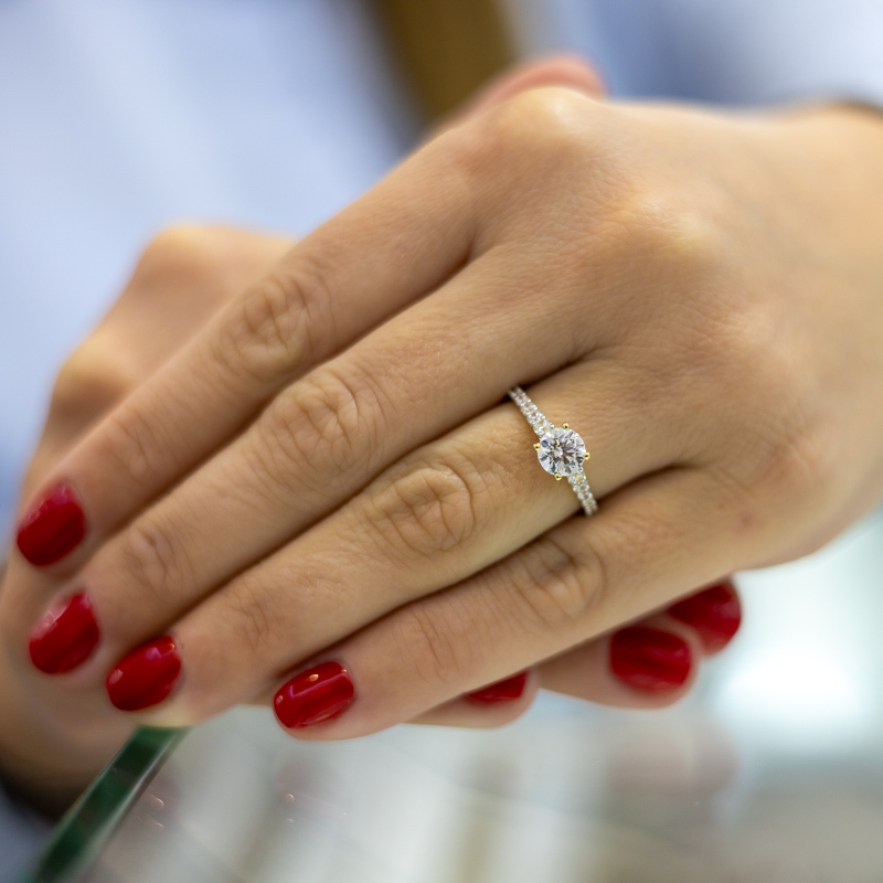 Prémium minőségű eljegyzési gyűrű egyenesen Németországból. A köveket erős foglalat tartja a helyén, így nyugodtan viselhető vízben is.
