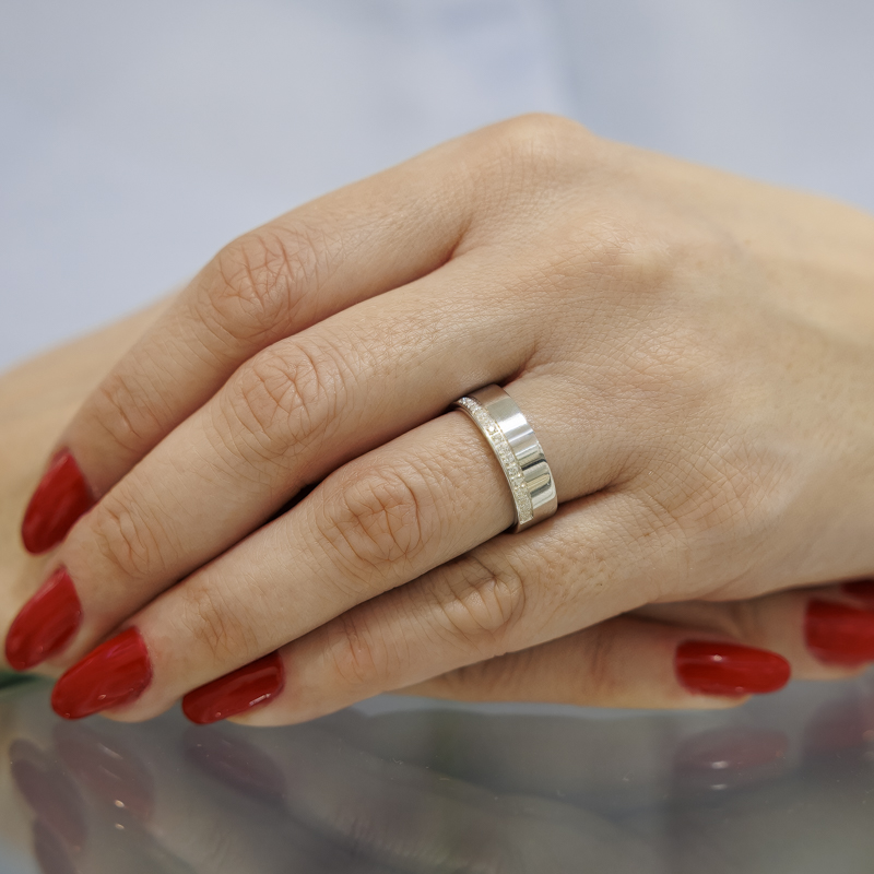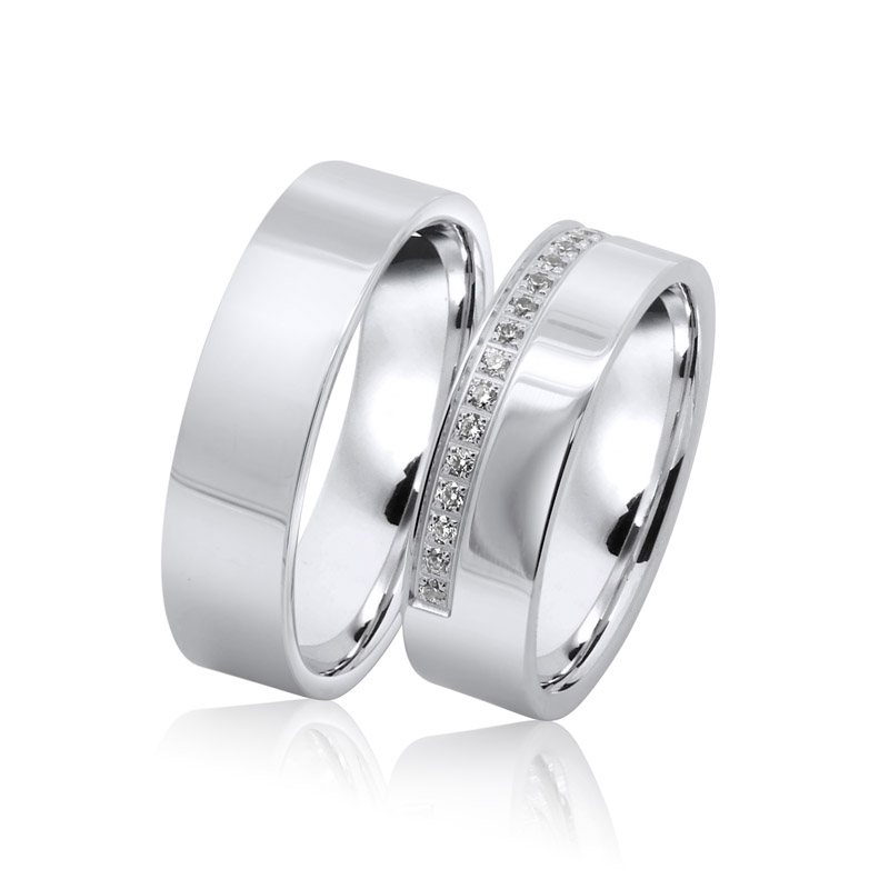 Különleges minőségű karikagyűrűk, domború komfort belsővel, lapos külső profillal. Elegáns, letisztult megjelenése szélességének köszönhető, amely 6 mm. A női darab ragyogását a cirkónia kövek biztosítják. A gyűrűpár készleten van üzletünkben.