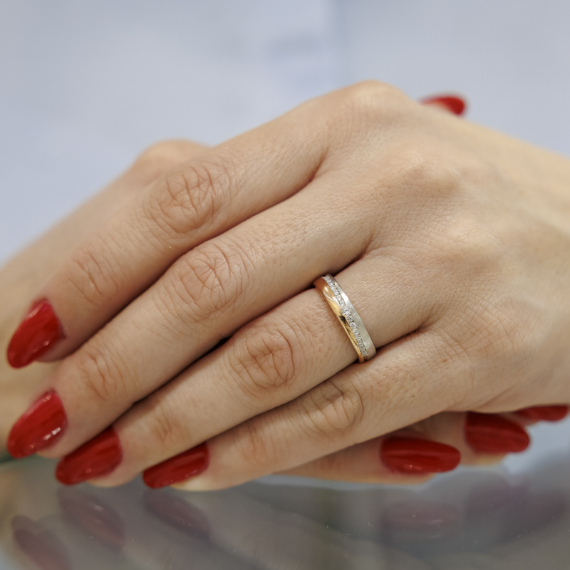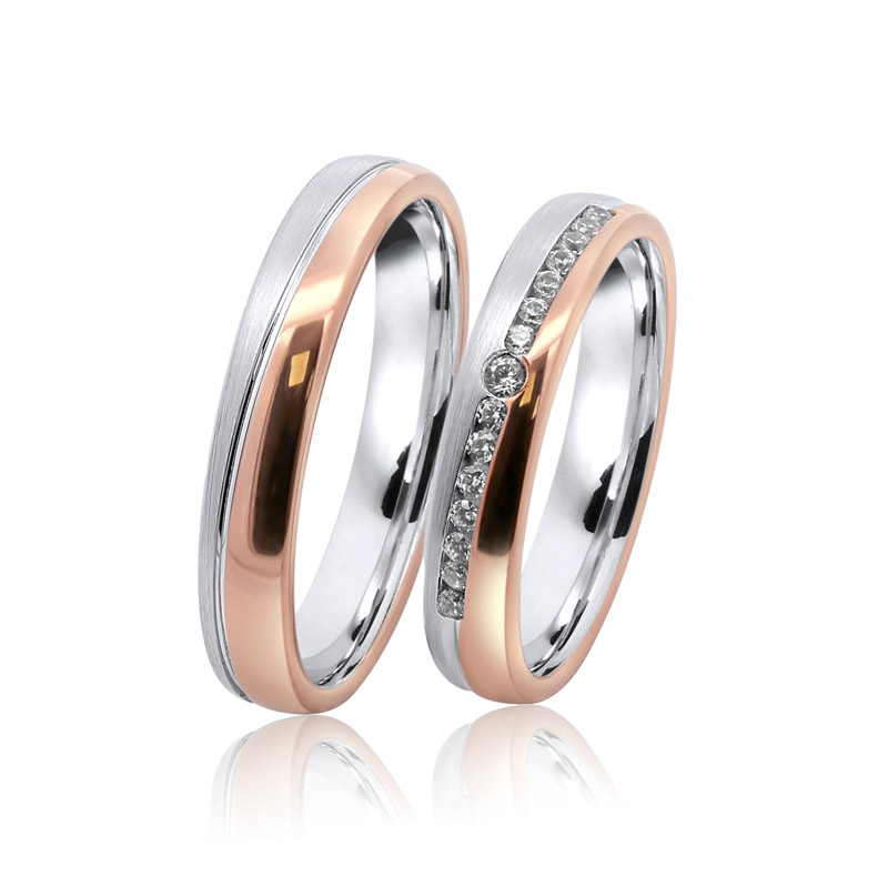 Különleges minőségű karikagyűrűk, domború komfort belsővel, klasszikus féldomború profillal. A cirkónia kristályok a rosé és a szálcsiszolt matt ezüst felület találkozásánál a nútba foglalva rendkívüli ragyogást kölcsönöznek a női darabnak, míg a párja a kövek nélküli egyszerűségével ragadja meg a figyelmet. A gyűrűpár 4 mm széles, készleten van üzletünkben.