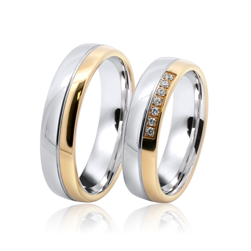5,5 mm széles, különleges minőségű karikagyűrűk, domború komfort belsővel, féldomború profillal. Sárga aranyozott része tökéletes allegóriája a meleg napsütésnek, melyet a női gyűrűben lévő kövezés koronáz meg. A gyűrűpár készleten van üzletünkben.
