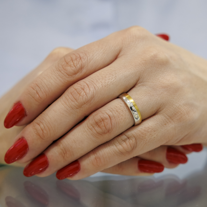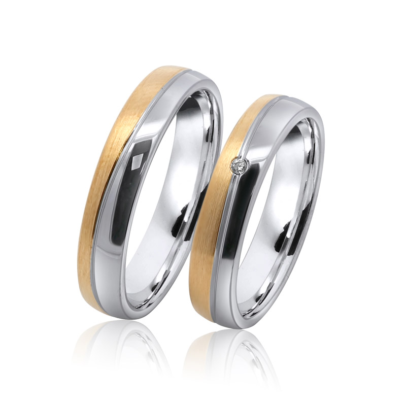 Különleges minőségű karikagyűrűk, domború komfort belsővel, klasszikus féldomború profillal. A felület sárga aranyozott részének szálcsiszolt mattítását megtöri a másik, ezüst résznek a fényessége, illetve a nőiben az 1db cirkónia kristály. A gyűrűpár 4,5 mm széles, készleten van üzletünkben.
