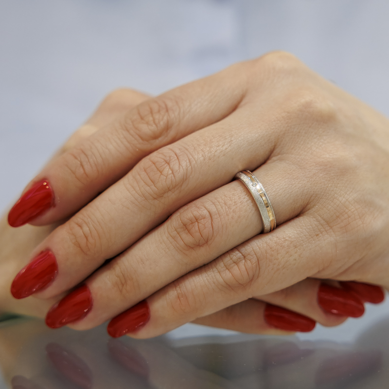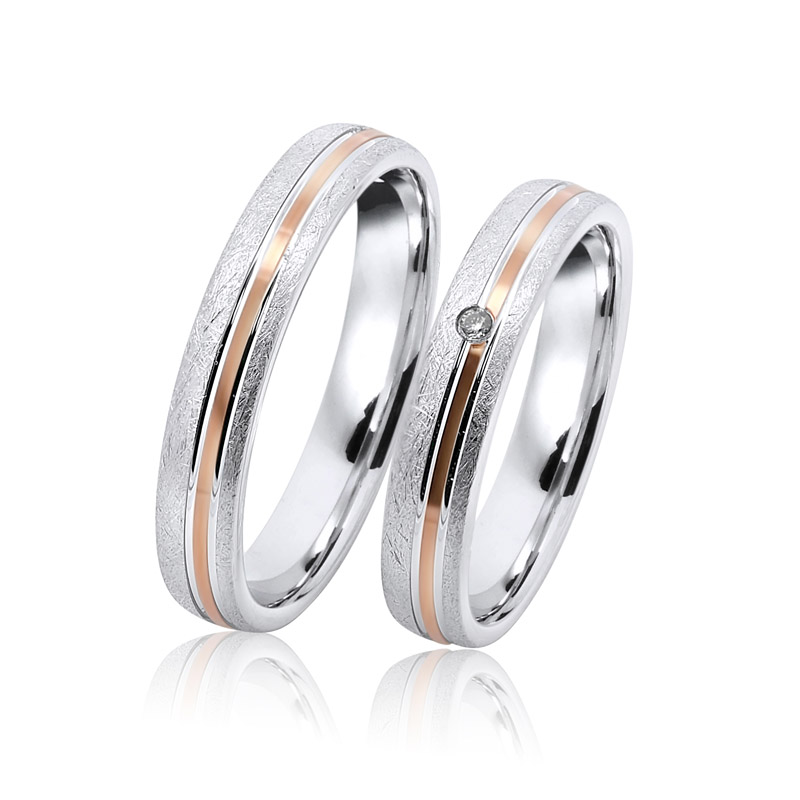 Különleges minőségű karikagyűrűk, domború komfort belsővel, klasszikus féldomború profillal. A gyűrűk az ezüst részen a megszokottól eltérő módon jégmattítottak, míg a vékonyabb, rosé aranyozott egyenes nút fényességével megtöri a felületet. A női gyűrűben 1 db cirkónia kristály ékeskedik. A gyűrűpár 4 mm széles, készleten van üzletünkben.