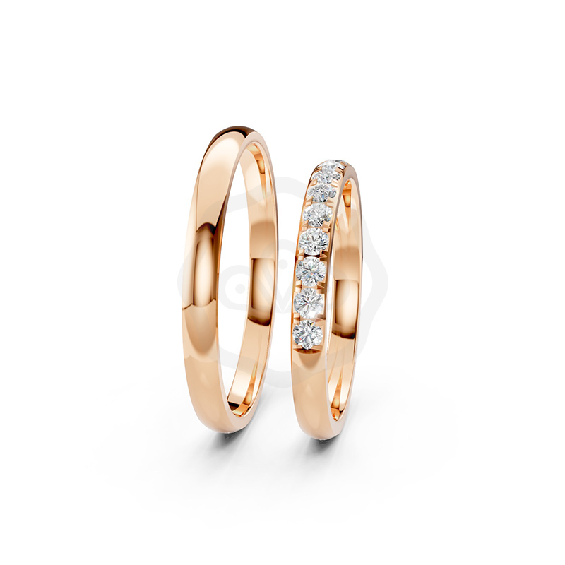Különleges minőségű karikagyűrűk, domború komfort belsővel, és gyönyörű köves női designnal. Ez a modell minta szerint 15db kővel készül, de szabadon tudjátok változtatni azok számát. A kövek árát a gyűrűk kalkulált anyagárához hozzá kell számolni. A gyűrűkből mintadarab található meg üzletünkben sárga és fehér aranyból, amit megnézhettek, megpróbálhattok. A rosé arany változat gyártási ideje 3-4 hét.
