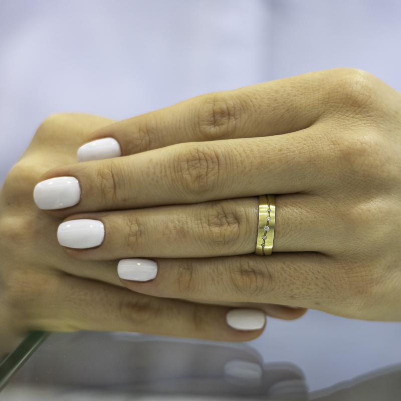 Különleges minőségű karikagyűrűk, domború komfort belsővel. A női modellt 5 kő díszíti, amit kérhettek cirkónia vagy gyémánt opcióval illetve kő nélkül is. A kövek árát a gyűrű kalkulált anyagárához hozzá kell számolni. A gyűrűkből női és férfi mintadarab található meg üzletünkben, amit megnézhettek, megpróbálhattok. A gyártási idő átlagosan 3-4 hét.